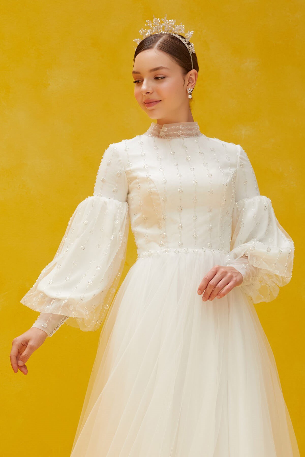 Ürün ekru renkte boncuk işlemeli kumaş kullanılarak tasarlanmıştır.