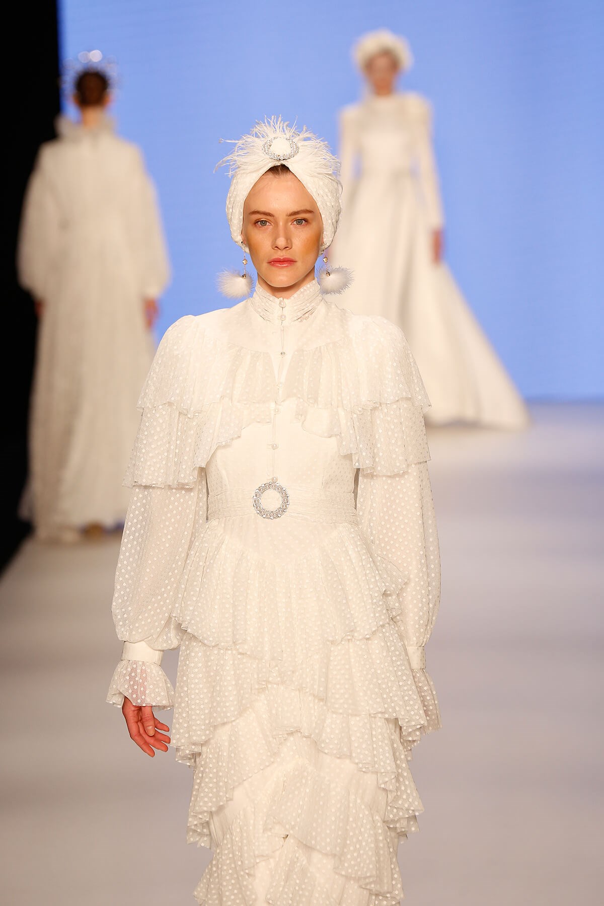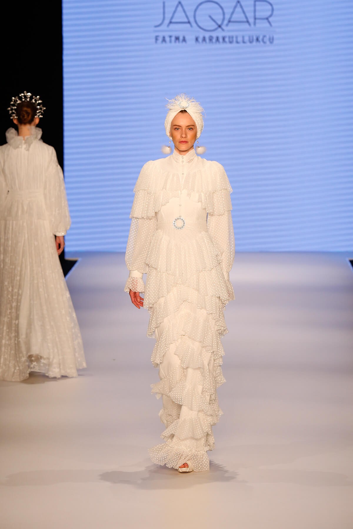 Polka Dot Tiered Wedding Dress The product is designed using polka dot textured tulle fabric in ecru with layers of frills. It has a pearl button detail on the upper part of dress. There is a belt buckle detail with pearl detail on the waist and it is fixed to the dress. The closure is provided with a zipper on the back. It is a vintage inspired design. The dress is lined and is not suitable for tarlatan use. IMPORTANT NOTE: This product will be produce according to your order and cannot be returned or exchanged. This product will be given to cargo company up to 25 working days,starting from the day your order is placed. CONTENTS 100% Polyester Standard dress length is 165 cm. The length of the mannequin is 170 cm. JAQAR SIZES Size 36: Waist 66 cm, Bust 86 cm, Hips 90 cm Size 38: Waist 70 cm, Bust 90 cm, Hips 94 cm Size 40: Waist 74 cm, Bust 94 cm, Hips 98 cm Size 42: Waist 78 cm, Bust 98 cm, Hips 102 cm