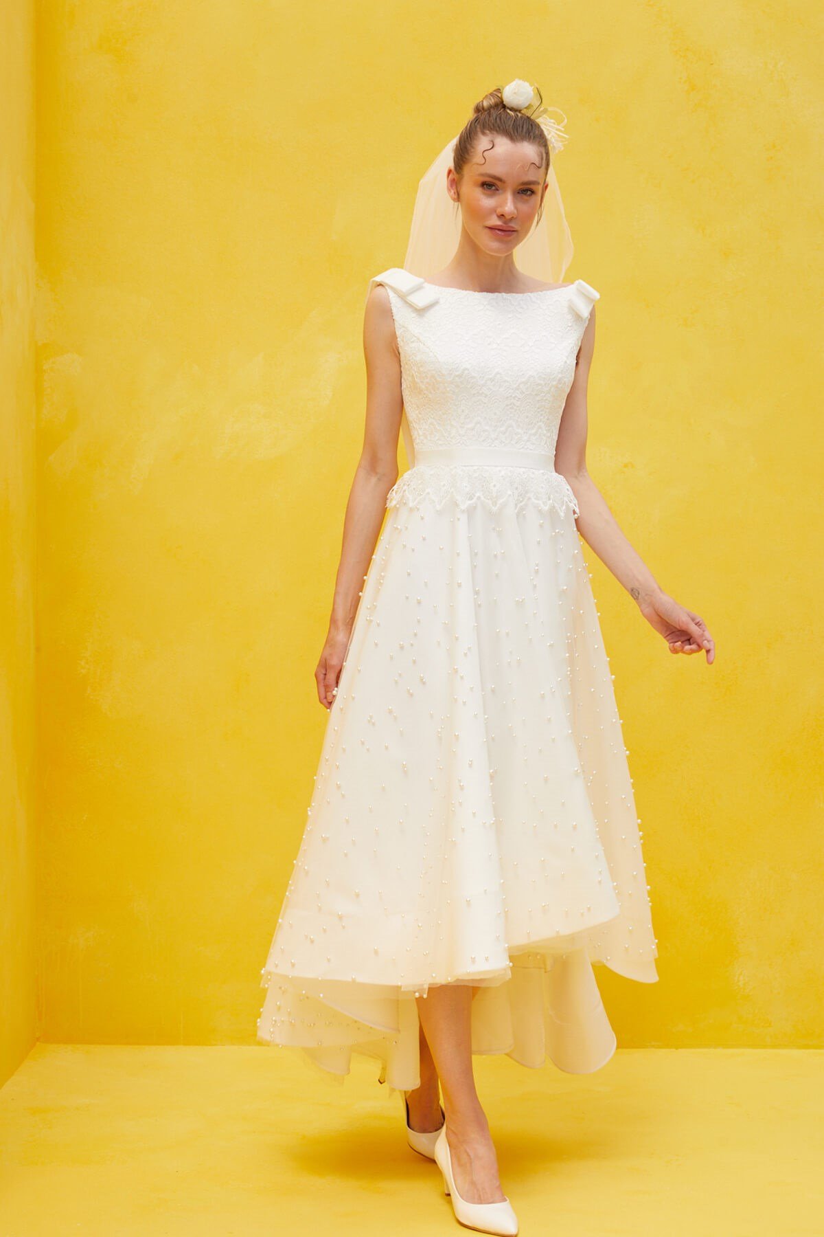 Guipure Detailed Pearl Embroidered Wedding Dress The product is in ecru color. It is designed by using guipure fabric on the upper body of the dress and pearl embroidered tulle fabric on the skirt. It has a boat neck. There are bow details on the shoulders. The dress is lined. IMPORTANT NOTE: This product will be produce according to your order and cannot be returned or exchanged. This product will be given to cargo company up to 25 working days,starting from the day your order is placed. CONTENTS 100% Polyester Standard dress length is 165 cm. The length of the mannequin is 170 cm. JAQAR Body Measurements for size 36; Waist: 66 cm Bust: 86 cm for size 38; Waist: 70 cm Bust: 90 cm for size 40; Waist: 74cm Bust: 94cm for size 42; Waist: 78 cm Bust: 98 cm
