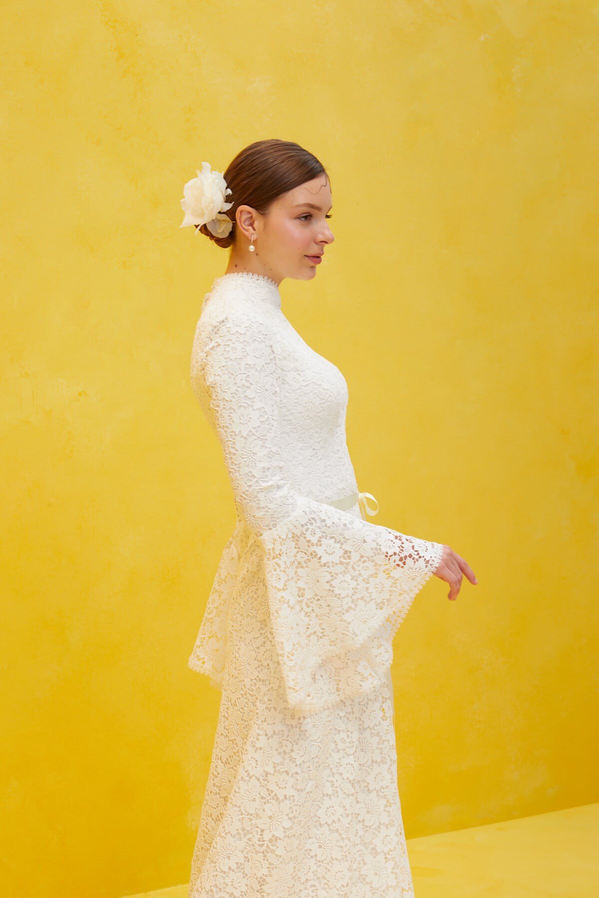 Ürün ekru renkte güpür dokulu dantel kullanılarak tasarlanmıştır.Hakim yakadır.Sırt kısmında bağcık ile kapanma sağlanmaktadır ve bu ayna zamanda ürünün bedene oturmasını kolaylaştırmaktadır.